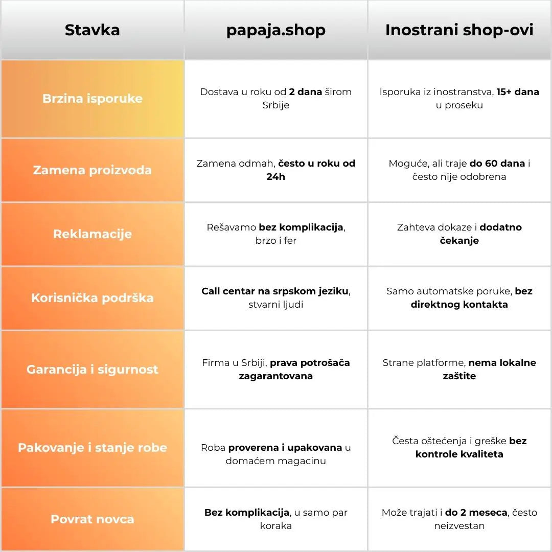 Za razliku od inostranih shop-ova, kod nas dobijate brzu isporuku, jasne uslove zamene i stvarnu korisničku podršku na srpskom jeziku. Sve rešavamo lokalno, brzo i bez komplikacija.